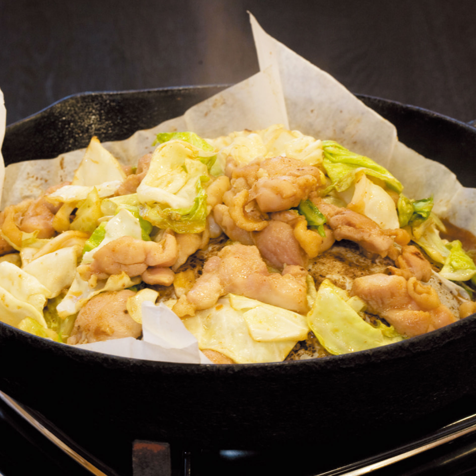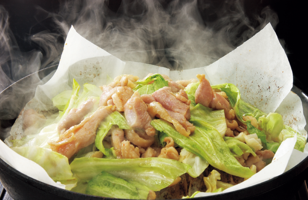 無添加肥料で育った岐阜県産恵那鶏モモ肉とキャベツを、秘伝のにんにく醤油ダレで焼く「鶏ちゃん」です。ジンギスカン鍋で焼く肉は柔らかく、お酒やご飯にも最適です。シメには、旨味が凝縮されたタレを絡めて味わう名物の焼きそばを投入するのが杉の子流の醍醐味です。